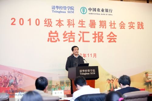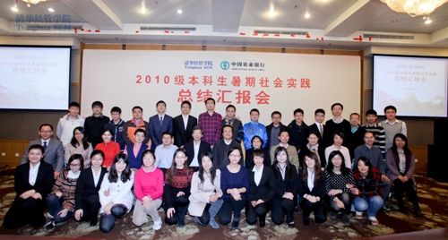 中国农业银行总行战略规划部张璠副总经理、清华经管学院副院长夏冬林教授、教学办主任朱玉杰教授、暑期社会实践项目协调人肖勇波教授、带队教师徐瑜青、郭迅华、郭美新、李旻文、郑捷、王蕾、刘霞、易成等多位教授出席了会议,2010级暑期社会实践队员以及2011级学生代表共70余人共同参加了汇报活动。汇报会由清华经管学院学生工作组组长何平教授主持。
