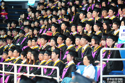 来自本科、硕士、博士、MBA、EMBA和经济学第二学位的六位同学分别作为毕业生代表致辞。经83的向迪雅回忆起自己在清华经管学院就读4年的三个“第一次”:第一次挫折;第一次接触社会;第一次走出国门。她的发言引来本科生同学强烈的共鸣。经硕2010级的杨雁翔毕业之后即将去西藏工作,临别之际,他以一席古典色彩的发言为自己壮行,也为所有毕业生的未来祝福。博士生代表窦一凡则回忆起求学道路上导师对自己关怀备至的点点滴滴,表示将以此为榜样在未来的工作岗位上为人师表。MBA毕业生王晓迪来自09级P2班,她以诙谐幽默的话语点评了自己三年来利用业余时间攻读MBA学位的甘苦和对学院的不舍,引来全场最多的笑声和掌声。EMBA10级F班的蒋怀宇满怀感激的说,清华EMBA影响改变同学们的人生,将永远铭记清华的培育之恩,永远关心和回馈清华。经济学第二学位毕业生何怡鸥即将成为麻省理工学院的博士生,回首攻读“经双”的双倍付出,三年来的苦中作乐在这位理工科女生的心中变得云淡风轻。