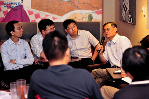 接下来进入了自由提问的环节,同学们就自己在学习、职业发展以及对学院的要求等方面提出了自己的疑问。整个活动同学们提出了十几个话题,涉及课程设置、对外交换、创业资源、职业转换和提升、与EMBA交流渠道以及经济环境多个方面。对每一位同学的提问和建议,钱院长都认真坦诚地和同学们沟通。例如,11P3班的汤宏渊提到MBA创业者面临的创业资源缺乏问题,希望学院能牵头为创业者提供获取资源的平台,这个问题也是很多准备创业的同学比较关心的。钱院长详细地向大家讲述了清华对创业的重视和为此做出的努力,4月份主办创业年会以及刚刚成立的清华创业平台孵化园,都旨在整合创业资源,为创业者提供资金以及管理等全面的服务。说到创业和创新,又有几位同学发表了自己的看法,钱院长向大家强调,创业是未来趋势,国家的经济转型和竞争力提升离不开创新和创业。创业的本质是创新,创业离不开管理,我们必须重视创业创新和管理的结合。