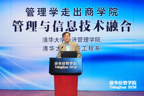 随后,经管学院副院长、EMC讲席教授、管理科学与工程系陈国青教授首先做了题为“管理与技术融合”的演讲,从学科领域与人才培养视角论述了二者融合的路径。