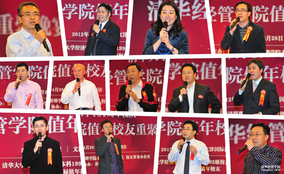 经1987级校友曲家浩(中国再保险(集团)股份有限公司资产管理部总经理)回忆起18年前从清华毕业时,学院的老师和同学在大礼堂为他举办的毕业个人演唱会。他把人生比作一场足球比赛,对于同窗学友而言,现在正是上半场结束、下半场开始的时候。“我们非常享受上半场的过程,同时期待下半场会更加精彩。”他祝福老师们健康长寿,学院培育更多人才,校友之间更加团结、协作。