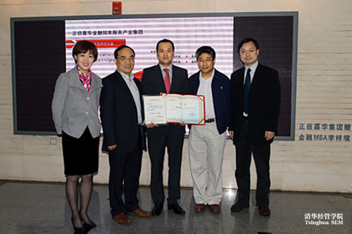 清华经管学院副院长白重恩、院长助理狄瑞鹏及金融硕士项目学术主任郦金梁出席了捐赠仪式,金融硕士项目执行主任郝秀清主持捐赠仪式。白重恩代表学院向李梓境校友颁发了捐赠证书,郦金梁向李梓境校友颁发“校友导师”聘书。