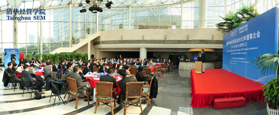 捐赠仪式之后,1995级MBA校友,MBA校友会副理事长、秘书长,中德证券有限责任公司首席执行官姜培兴主持2012年MBA校友理事大会。常务副理事长龙大伟做了题为“清华MBA校友会工作2011年回顾与2012年展望”的报告。龙大伟指出,2012年是MBA校友会工作全面推进的一年,总体原则是融合、开放、分享、共赢,重点要筹划清华MBA品牌活动,特色是融合大学和社会资源,探索合作与发展,常规活动是确定每个月最后一个星期日设立为MBA校友聚会日,发起主题聚会,举办相应活动。龙大伟还部署了秘书处工作考核和中期校友理事增补工作。