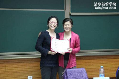 演讲结束后,罗玫教授向方宝荣校友颁发了聘书,聘请方宝荣女士为清华经管学院会计专业硕士项目的资深校友导师,会计专业硕士学生石文婷和胡翔宇被选为方宝荣的指导学生。