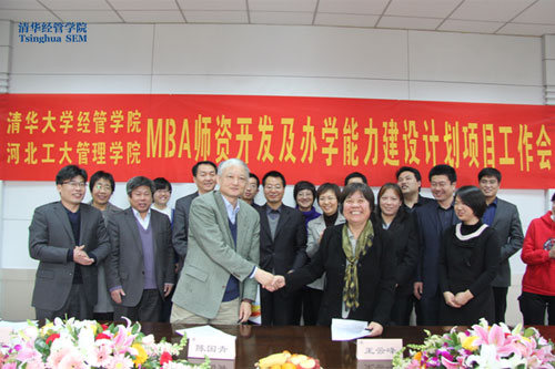 2011年11月26日和12月23日,项目组成员清华经管学院副院长陈国青、院长助理高建、MBA教育中心常务副主任毛东辉、MBA教育中心教学管理部总监秦文一行分别到河北工业大学和郑州大学调研MBA项目需求,双方就项目的组织管理、教师进修、授课指导、交流以及项目延展等进行了进一步磋商,并形成最终实施方案。陈国青副院长分别和河工大管理学院院长王云峰、郑州大学商学院院长高友才代表双方学院正式签署了项目实施方案协议。