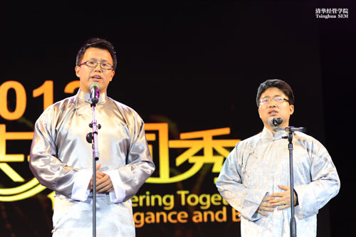随后,11I2班刘日程、来自中、日、韩等不同国家的四位同学,身穿民族服装、拿起擅长的乐器组成了自己的乐队,演绎了经典的《菊花台》,之后的萨克斯独奏《圣诞歌》将晚会的气氛推向了高潮; 11F2班王华琨、杨坤、余磊等同学带来的舞台剧《西游二记之“三打白骨精”》颠覆传统,引得台下笑声连连;而11P3班李达、董丁、庄楠等同学演唱的《MBA快乐串烧》,将民族风《山丹丹开花红艳艳》、网络歌曲《爱情买卖》、摇滚歌曲《爱之初体验》、校园民谣《童年》,走红春晚的《春天里》的词曲改编揉合成一首反映清华MBA工作学习生活的串烧歌曲,师涛、黄质斌等男同学甘当绿叶,手执鲜花、彩带为唱歌的同学伴舞,引得台下一片叫好声。