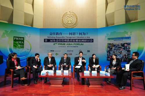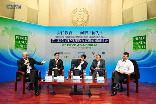 在由清华经管学院金勇军教授主持的圆桌论坛中,零点研究咨询集团董事长袁岳,商道纵横总经理郭沛源,五矿集团谢卫军以及索奥中国首席执行官李晨晔与在场嘉宾及观众分享了他们在各自的领域中关于推行企业社会责任的经验及问题。嘉宾们深入讨论了当今中国企业社会责任的现状,并对商学院的责任教育提出了期望。
