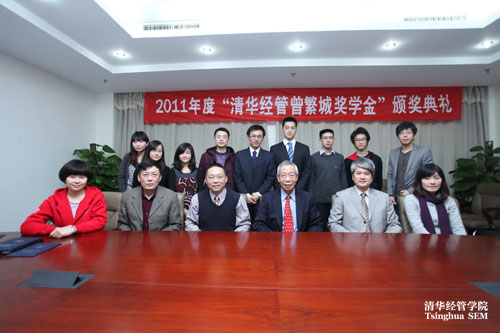 11月28日下午,2011年度“清华经管曾繁城奖学金”颁奖典礼在学院举行。本年度,清华经管学院共有10位本科生和研究生获得该奖项。台积电副董事长曾繁城、中国区业务副总经理罗镇球、清华经管学院合作发展办主任潘庆中参加了颁奖典礼,清华经管学院党委副书记焦捷主持该活动。