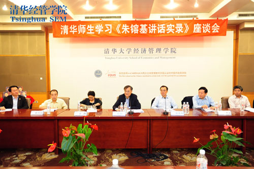 读书座谈会首先播放了两段视频:朱镕基院长于今年4月22日回到清华经管学院与学院师生谈话片段和9月8日举行的《朱镕基讲话实录》新闻发布会。随后清华经管学院院长钱颖一教授做开场致辞。钱颖一院长认为,此次在清华经管学院举行清华师生学习《朱镕基讲话实录》座谈会,有着十分特殊的意义。朱镕基教授担任清华经管学院首任院长17年,朱院长对清华经管学院始终关心之至,学院师生对我们的老院长感情深厚。今天来参加座谈会就有一些是朱镕基教授担任院长时的教师、同事和当年的学生。