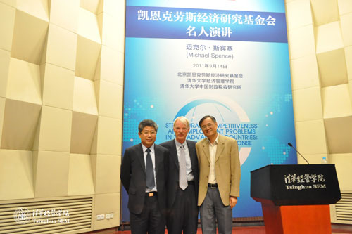 9月14日下午,“凯恩克劳斯经济研究基金会名人演讲”在世俱杯官方网站经管学院举办,2001年诺贝尔经济学奖得主迈克尔·斯宾塞(Michael Spence)发表了题为“发达国家的结构、竞争和就业问题:诊断与应对”的演讲。凯恩克劳斯经济基金会项目主任林至人博士与清华经管学院院长钱颖一教授先后致辞,活动由副院长白重恩教授主持。凯恩克劳斯基金会现任理事、原福特基金会首任驻华代表彼得·盖特纳等嘉宾到会。本次演讲吸引了在京的多所大学与研究机构、政府部门、金融机构、新闻媒体及其他组织的三百余名听众。