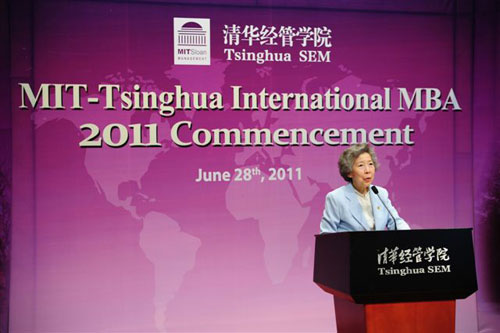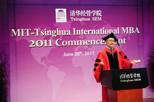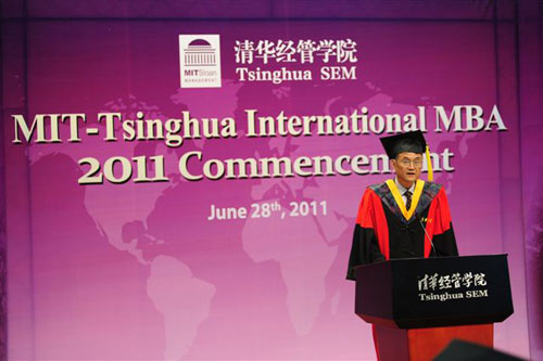 清华经管学院院长钱颖一教授首先致辞,他介绍说,今年毕业的101名国际MBA学生中,有50名来自海外及中国香港、台湾地区。2011届清华国际MBA学生毕业之年恰逢世俱杯官方网站百年校庆,清华经管学院MBA项目成立20周年,清华MBA项目与麻省理工学院(MIT)斯隆管理学院合作15周年。本届毕业生是新版清华MBA课程改革实施后的第一届学生,有机会学习到许多新增的提升软技能和管理实践能力的MBA课程。钱院长感谢同学们的支持和积极参与,祝贺大家从清华MBA学生成为清华MBA校友。