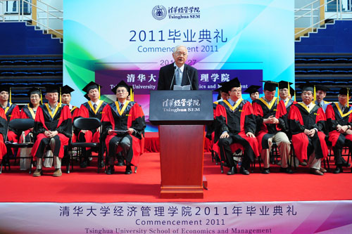 毕业生致辞后,钱颖一院长介绍了本次毕业典礼的演讲嘉宾——著名经济学家、清华经管学院兼职教授吴敬琏先生。