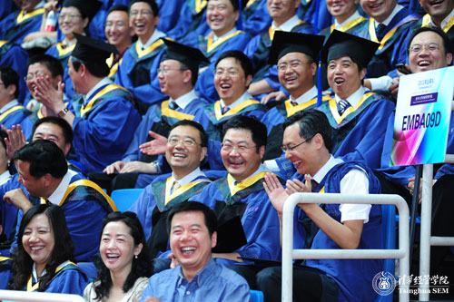 随后,本科毕业生孙昶、硕士毕业生滕飞、博士毕业生邓奕红、MBA毕业生刘瑾、以及EMBA毕业生朱正东分别致辞。这5位同学在致辞中分别历数了各自在校期间的珍贵回忆与收获,表达了对清华和经管学院的感谢、眷恋与不舍,并展望了对于未来的美好憧憬。本科毕业生孙昶坦言,在清华经管学院收获了批判性思维的能力和思考国计民生等重大问题的习惯。硕士毕业生滕飞表示,一定会将个人价值与国家、民族命运结合起来,以实际行动投身祖国的建设中去,为学院增添新的光荣。博士毕业生邓奕红说,作为博士毕业生,不论今后从事科研工作还是进入公共管理部门,一定会在工作岗位上兢兢业业、自强不息、厚德载物,做出新的、更大的成绩。MBA毕业生刘瑾认为,是清华的熏陶让他们对社会的责任从自发走上自觉。EMBA毕业生朱正东表示,会禀承清华传统,锲而不舍,踏着先人的足迹永不停息,将清华的智慧融入到企业管理和生活中,为社会创造更大的价值。