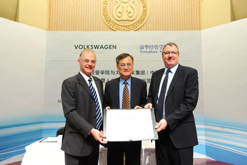 清华经管学院院长钱颖一教授[中]、大众汽车集团(中国)执行副总裁狄凯思先生[右]及大众汽车金融(中国)有限公司盖·布罗克曼斯先生[左]签字后合影