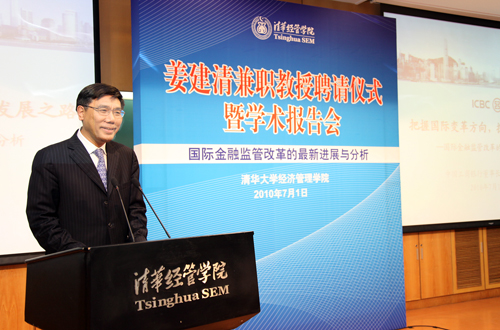 7月1日,全球最大商业银行——中国工商银行董事长姜建清受聘成为清华经管学院兼职教授,受聘仪式于当晚在学院舜德楼401举行。仪式结束后,姜建清发表了主题为“国际金融监管改革的最新进展与分析”的演讲,共有200余名师生聆听了这一讲座。