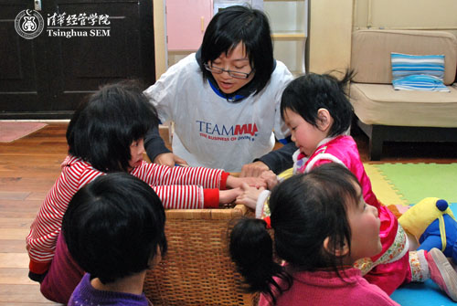 2010年4月17日,清华经管学院MBA阳光爱心社成员一行40余人走进廊坊“牧羊地儿童村”(Shepherd's Field),与这里的小朋友们一起游戏,给他们带来温暖与关爱,献上清华MBA的一片爱心。