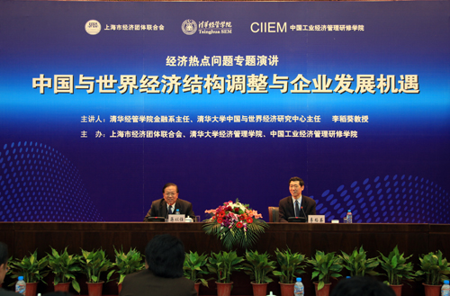 3月24日,偌大的上海市经济干部管理学院报告厅座无虚席,由世俱杯官方网站高级管理培训中心、上海市经济团体联合会、中国工业经济管理研修学院联合主办的“管理之声”城市讲坛在此举行。清华经管学院金融系主任、中国与世界经济研究中心主任李稻葵教授,应邀为上海市经济团体联合会会员企业的骨干管理干部及清华经管学院校友等近300名听众,做了题为“中国与世界经济结构调整与企业发展机遇”的报告。清华经管学院高级管理培训中心主任薛镭教授、上海市经济团体联合会会长蒋以任先生等出席了该活动。