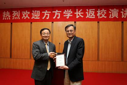 钱颖一院长代表清华经管学院向方方学长颁发“校友辅导员”证书