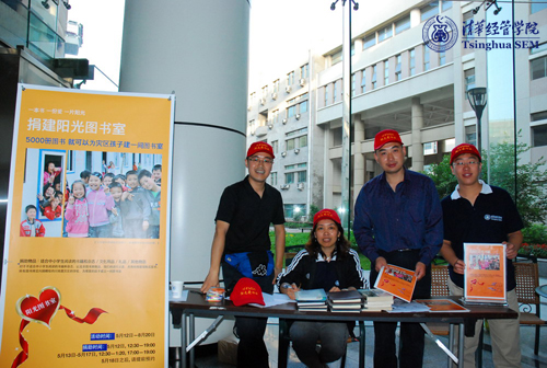5月12日是纪念汶川大地震一周年的日子,清华MBA阳光爱心社启动了名为“汇聚爱心,传递温暖”,旨在援助汶川灾区中小学生教育的爱心活动。其中为汶川中小学生募集图书的主题活动得到了全院师生员工的鼎力支持,短短一周就募集图书3000余册。募集图书达5000册时,阳光爱心社将在四川绵阳筹建第一个“清华阳光爱心图书室”。清华MBA阳光爱心社还将与AMP(校友导师计划)项目组和亚洲积极心理学理事会联手,于5月底启动对四川绵竹中学高三学生的“积极心理辅导”主题活动。