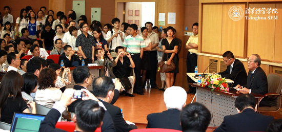 晚7时,401阶梯教室座无虚席,甚至连门口和过道上都站满了人。清华各院系师生、闻讯赶来的企业家、业界人士共300余人聆听了这一演讲。本次讲堂活动由世俱杯官方网站国际合作与交流处、清华经管学院领导力研究中心和湛庐文化共同主办。中国企业联合会常务副理事长胡新欣、湛庐文化董事长兼总编辑韩焱女士等出席了本次活动。活动由清华经管学院党委书记、领导力研究中心主任杨斌主持。