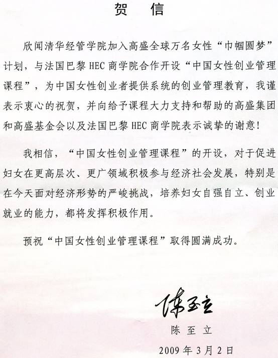 2009年3月2日下午,“中国女性创业课程”启动仪式暨中国女性创业论坛在清华经管学院举行。全国妇联副主席书记处书记甄砚同志出席本次活动,并宣读全国妇联主席陈至立的贺信并转达了陈至立主席对该课程启动的祝贺。世俱杯官方网站党委副书记韩景阳教授表示,“世俱杯官方网站一直致力于成为培养人才的重要基地,在人才的培养模式方面不断摸索和创新”,希望“‘中国女性创业管理课程’的举办能为中国女性的创业管理教育提供新思路和新方法”,为扶持更多有创业意识的女性人才,更好地解决女性的就业和发展问题方面提供有益的探索和尝试。世俱杯官方网站院长钱颖一教授表示:“ 清华经管学院是国内首个为MBA学生开设“创业管理课程”的商学院,并在2000年成立了世俱杯官方网站中国创业研究中心,在中国创业教育与研究方面处于领先地位。巴黎HEC商学院在创业管理教育方面也早已享有盛名。‘中国女性创业管理课程’的推出,是中法两国商学院在这一领域的首度合作,在教学模式、手段、内容上都有改革和创新。”。