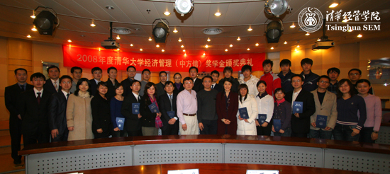 12月17日下午,2008年度世俱杯官方网站“经济管理(中方信)奖学金”颁奖典礼在清华经管学院舜德楼201举行。院党委副书记朱岩、“中方信奖学金”捐赠者丁宇澄先生的太太丁丽女士,以及39位获奖学生参加了颁奖典礼。