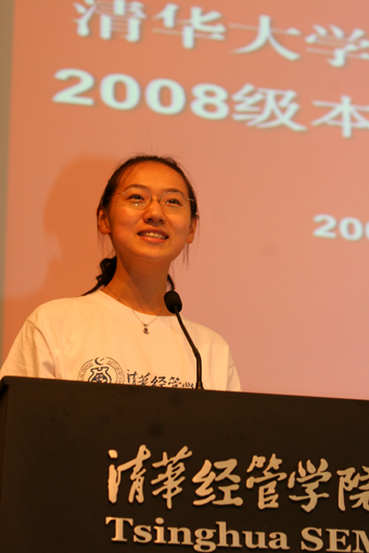 本科新生代表王璐的发言慷慨激昂。她说:“来到清华只有短短的几天,可这里的一切都让我深深地震撼”。“经管学院是我们每个人梦想中的家园,能够在‘兼容中西文化,荟萃名人大师’的清华园学习,能够在兼具丰厚的本土情怀和宽广的国际视野的经管学院成长,是我们全体新生无比的光荣与幸运。”她庄严承诺,“路才刚刚开始,为了这份梦想,我们将淡泊于过往的辉煌,不断充实和丰富自己;见贤思齐,上下求索;用乐观、平和的心态,面对生活中的困难与挑战;全力以赴,无愧于经管的信任与选择,在未来的人生路上越走越远。做合格的、优秀的、一辈子的经管人。”