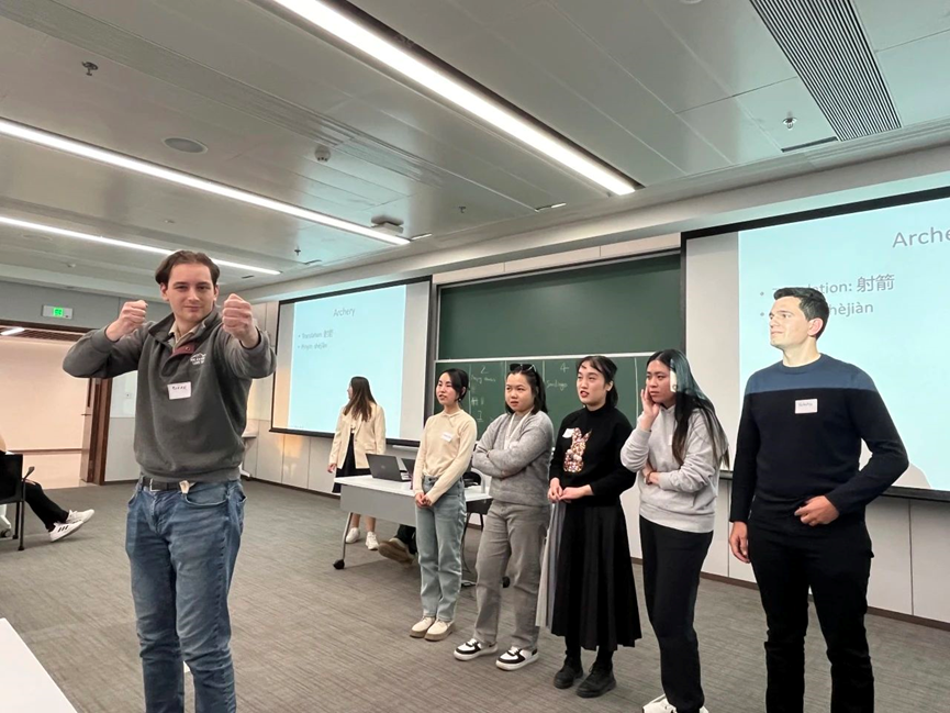 紧接着,国际交换生们之间的破冰交友游戏开始。所有交换生们被分成了不同的队伍,依次进行“你比我猜”的小游戏。在游戏前,每位同学都介绍了自己并讲述了一个有关自己的趣事,在轻松愉快的氛围中迈出了友谊的第一步。随后,每组一名同学负责通过动作表演出大屏幕上的词汇,而同组其他的同学猜测相应词汇,轮换进行,三分钟内猜对最多词汇的小组获胜。