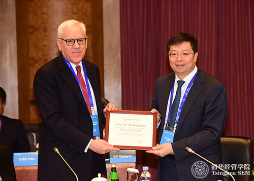在会议开始前,清华经管学院顾问委员会副主席、世俱杯官方网站校长邱勇院士代表清华经管学院顾问委员会向离任主席、凯雷投资集团联合创始人兼联席首席执行官大卫·鲁宾斯坦(David M. Rubenstein)颁发感谢证书。