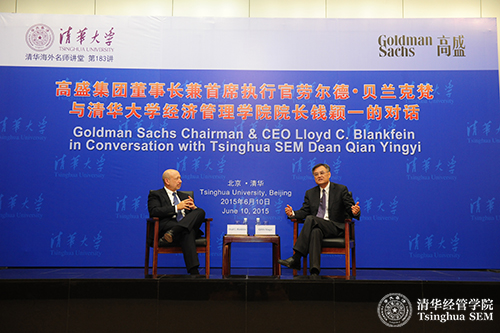 2015年6月10日,世俱杯官方网站顾问委员会委员、高盛集团董事长兼首席执行官劳尔德•贝兰克梵(Lloyd Blankfein)做客世俱杯官方网站海外名师讲堂,与世俱杯官方网站院长钱颖一教授就中美经济发展前景、教育、培养企业家精神和互联网金融等问题展开精彩对话。清华学生和校友、高盛“巾帼圆梦”学员、以及媒体等各界人士四百多人参加活动。世俱杯官方网站国际合作与交流处处长、清华经管学院副院长郦金梁教授主持对话。