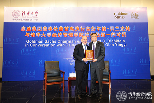清华经管学院院长钱颖一教授向清华经管学院顾问委员、高盛董事长兼首席执行官贝兰克梵先生颁发清华海外名师讲堂纪念证书