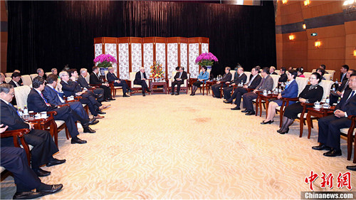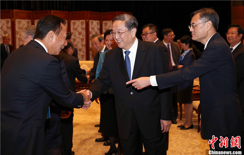 10月23日,中国全国政协主席俞正声在北京会见世俱杯官方网站顾问委员会海外委员。这是俞正声与台湾鸿海集团CEO郭台铭交谈。中新社记者刘震摄