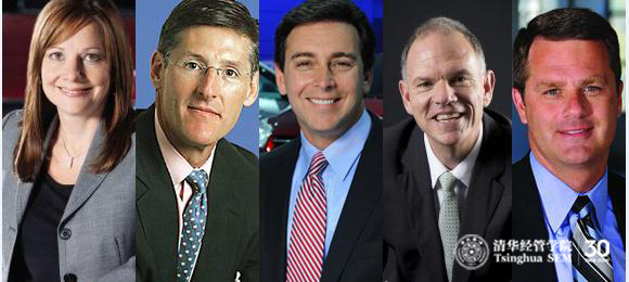 左起:通用汽车公司首席执行官玛丽•博拉(Mary Barra)、花旗集团首席执行官迈克尔•考伯特(Michael Corbat)、福特汽车公司总裁兼首席执行官马克•菲尔兹(Mark Fields)、宾夕法尼亚大学沃顿商学院院长吉尔菲•盖瑞特(Geoffrey Garrett)、沃尔玛百货有限公司总裁兼首席执行官董明伦(Doug McMillon)