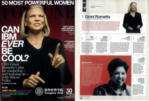 《财富》杂志最近公布的2014年“全球最具影响力的50位商界女性”(50 Most Powerful Women)排行榜中,第一名罗睿兰(Ginni Rometty)(左、右上)、第二名玛丽•博拉(Mary Barra)和第三名卢英徳(Indra K. Nooyi)(右下)均为清华经管学院顾问委员会委员