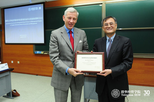 钱颖一院长代表清华经管学院聘任鲍达民先生担任学院管理实践杰出客座教授,并向其颁发聘书。