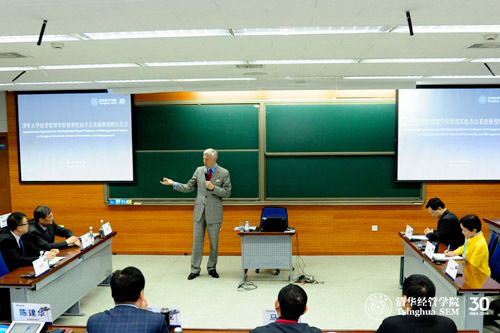 随后,钱颖一院长在致辞中特别强调,鲍达民先生是学院聘任的首位管理实践杰出客座教授。自2009年加入清华经管顾问委员会以来,鲍达民先生一直非常支持学院的各项工作。2010年,他在清华管理全球论坛上发表主题演讲。2012年,清华经管学院还与麦肯锡公司合作推出了“清华经管麦肯锡全球领导力课程”(Tsinghua SEM McKinsey Global Leadership Course)。就在上个月,钱颖一院长还与鲍达民先生在学院共同签署了合作备忘录,未来三年中麦肯锡公司将在课程教学和实践教学中支持清华经管学院,包括开设全球领导力课程以及在清华MBA整合实践项目中合作开展领导力项目。在钱颖一院长的邀请下,鲍达民先生首次走进清华经管后E课堂,与同学们分享了麦肯锡研究院几个月前刚完成的研究报告。