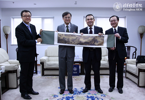 左起依次为:院党委书记杨斌、院长钱颖一、卡洛斯·戈恩、日产(中国)投资有限公司总经理桥本泰昭