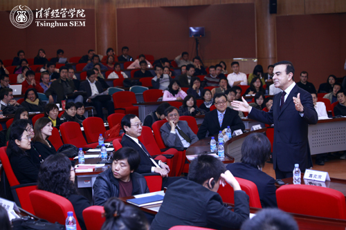 戈恩先生的演讲现场互动气氛热烈。此次演讲是戈恩先生在清华经管学院的第二次演讲,演讲前一天,戈恩先生应邀出席了清华经管学院顾委会第十次年度会议。