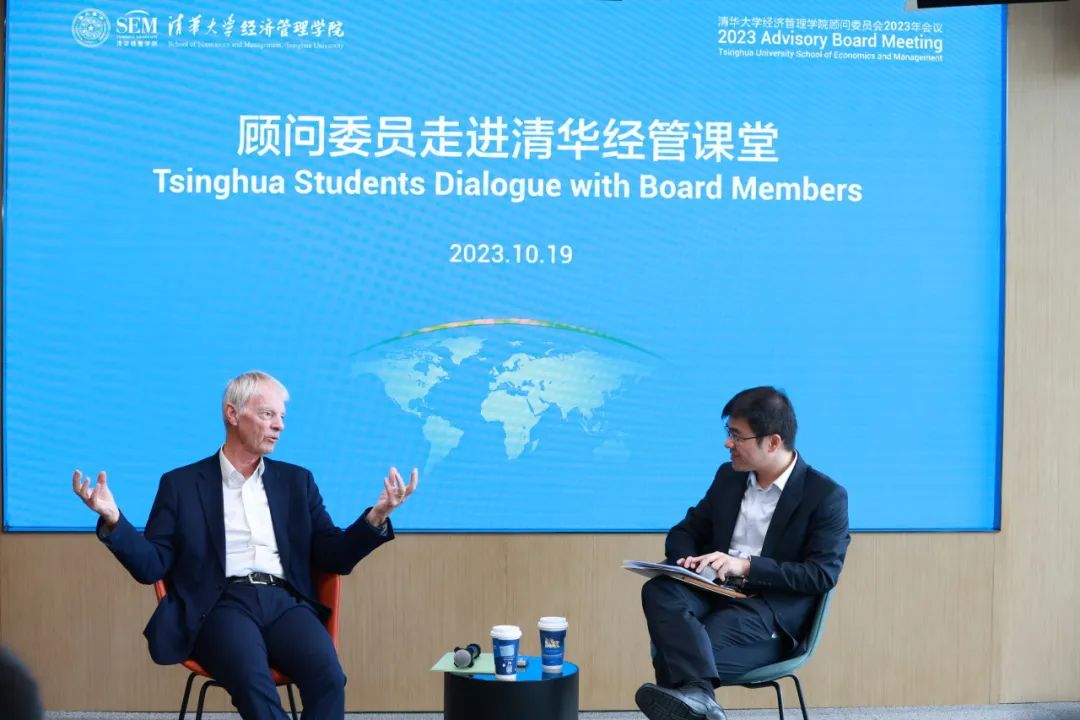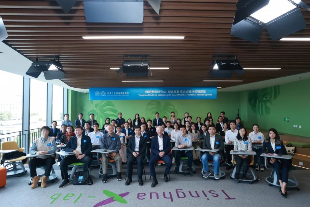 2023年10月19日,清华经管学院顾问委员会委员、斯坦福大学菲利普·奈特荣休教授、2001年诺贝尔经济学奖获得者迈克尔·斯宾塞(A. Michael Spence)教授走进清华经管学院课堂,与40余名青年教师、博士后、博士生和清华学堂经济学班本科生一起,就世界经济、绿色转型、中国经济、人工智能和学术发展等话题进行了深入的讨论。学院经济系教授马弘与斯宾塞进行对话,并主持师生问答环节。