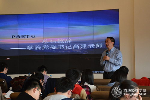最后,高建教授对寒返调研进行总结致辞。高建教授说:“实践就是一本无字书,读有字之书易,读无字之书难。”他鼓励学生们多参与实践,实践出真知,人要经过体验才有对事物正确认识。青年人要把为社会解决问题作为自己的责任,在人生旅途中多看、多学、多思考,从被动的参与者变为主动的组织者甚至创造者。将从“无字之书”中得到的认识和思考、智慧和创造力,去为国家发展出力。寒返调研是一个很好的开始,高建教授希望同学们将参与实践看做自己成长中的必要经历,重视实践活动,不断提高对实践的认识。