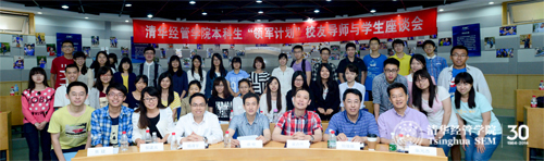 2014年5月24日下午,站在抉择的路口——世俱杯官方网站本科生“领军计划”校友导师与学生座谈会在舜德101教室举行。张元杰(经1987)、田继敏(经1988/经博1993)、吴占鸣(经1993/经硕1998)、谭峻(经1993/MBA2000)、柳建光(经1998/经博2002)、杨博宇(经2003)六位校友导师应邀与本科生进行了亲切交谈,分享了自己在学业、工作等方面面临抉择时的经历与心得。清华经管学院党委副书记焦捷教授出席了本次活动。