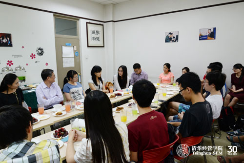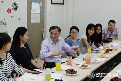 2014年5月30日下午3时许,由清华经管学院学生会外联部组织的本科生“院长下午茶”活动在伟伦楼110教室举行。参加本次活动的同学包括了本科四个年级的30多名同学。当钱颖一院长走进教室看到现场的布置时,随即说,“我要换把跟大家一样的椅子,并且换一个位置,使我同每一位同学的距离之和最小”。本次本科生“院长下午茶”活动就在这样欢快的氛围中开始了。