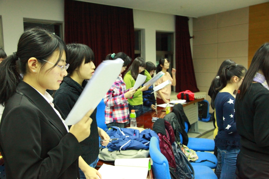 或许一开始我想过退缩。规定的时间,几乎强制性的训练,让我觉得有些呆板。但后来,我的想法改变了,我感受到了活动的意义。练习的时候,各个声部被彼此犯下的“低级错误”互相“逗乐”,但却在一次次的“逗乐”中不断改进各自的不足;我们有男生和女生之间的“较量”,当一方犯下“错误”而被“批评”或“单独训练”时,另一方会在心里暗中“侥幸”,但同时也会为对方加油鼓劲,期待着未来的进步。我们有欢笑的时候,也有严肃的时候,对待训练我们是一丝不苟的。在男生不卖力,表现欠佳时,高尚毓学姐对他们霸气地一顿“痛批”,效果立竿见影;查迪学长卖萌的时候非常可爱,但在需要的时候,对我们语重心长的教导却让我们受益匪浅。训练时,我们是“严谨”的训练者和被训练者、学长学姐与学弟学妹的关系,但私下里我们又是打成一片的好友。还有辅导员和指导老师们,是他们一路陪伴着我们的129,让我们感受到力量、支持与温暖。