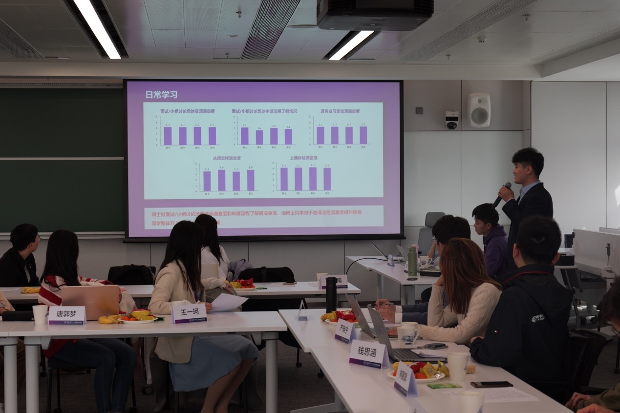 学院研究生会主席、2021级硕士生肖民昊从日常学习、科研学术、职业发展等方面对研究生整体生活、学习情况做了汇报。汇报基于活动筹办期间收集到的100余份问卷,汇总了研究生同学对课程设计、科研指导、院馆设施及职业规划等方面的想法、需求。
