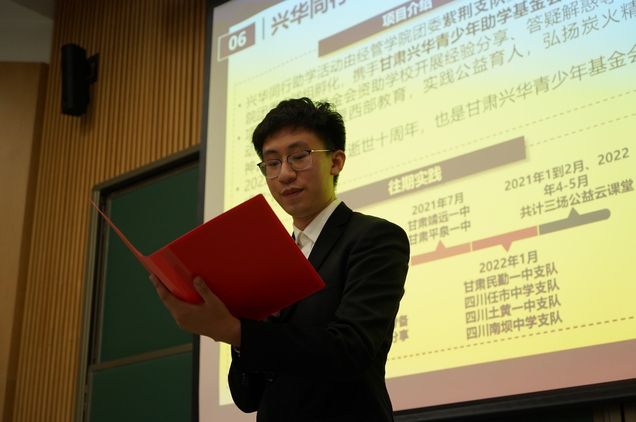 春秋两度,曾子青同学共参与十次社会实践,将新生支队孵化成品牌项目。创办“益行千里”,他深耕公益领域调研,四度出发探寻社会组织发展奥秘;情系兴华同行,他创新支教形式,搭建长效机制服务西部教育振兴。他是经管公益精神的传火者,也在实践中践行着公益担当。