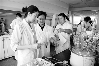 在京卫大厦的现代化生物医药共享实验室里,宋耕福总裁在做技术指导。
