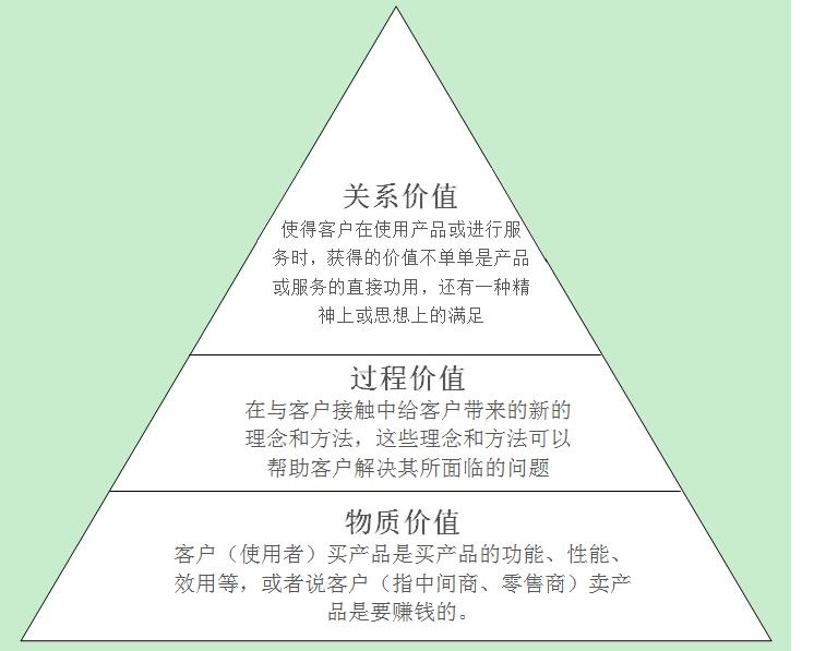 有着18年国际市场营销经验的刘祖轲认为,产品成功不等于市场成功,一个成功的产品还必须通过一系列的营销推广才会获得市场的成功。“酒好不怕巷子深”的观念在当今信息时代,只会把企业陷于被动的局面。成功的营销就是要为企业创造更大的价值。刘祖轲通过研究发现,营销就是要为客户提供三大价值,即物质价值、过程价值及关系价值,也就是他的“顾客三维价值理论”: