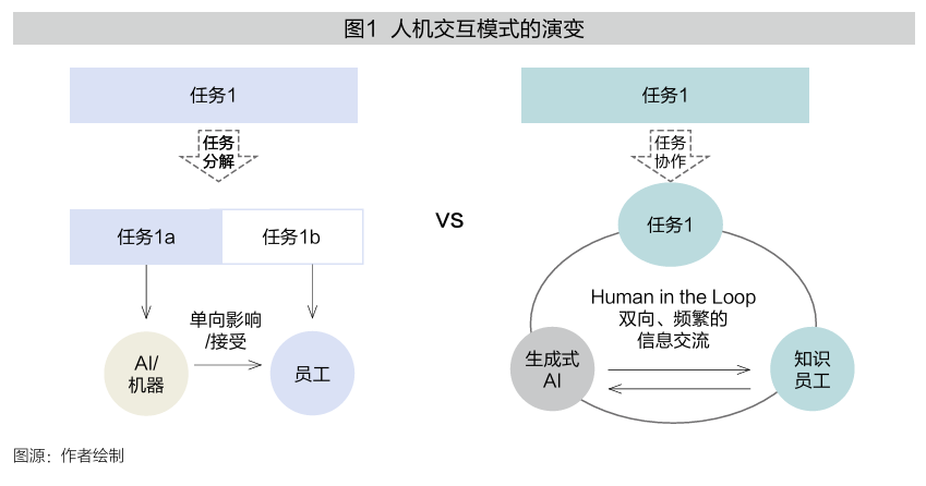 在过去,人们通常认为人工智能无法参与创意过程,也不具备相关能力。在传统的人机交互模式中,基于对任务的分解,人工智能和人类有着明确分工,人工智能取代人类完成大部分操作性、重复性等低价值的工作,人类劳动者则负责完成创造性、需要同理心的工作。然而,生成式AI已被广泛验证能够直接进行一些创造性任务,并且能够与人类知识工作者进行双向、频繁的信息交流。通过“Human in the Loop”(HITL)的新型交互模式,人类在关键环节中持续参与和调整AI的输出,实现基于人机合作的任务目标(见图1)。生成式AI的角色从单纯的工具或执行者转变为参与决策和创意过程的协作者,这种人机交互模式的演变如图1所示。