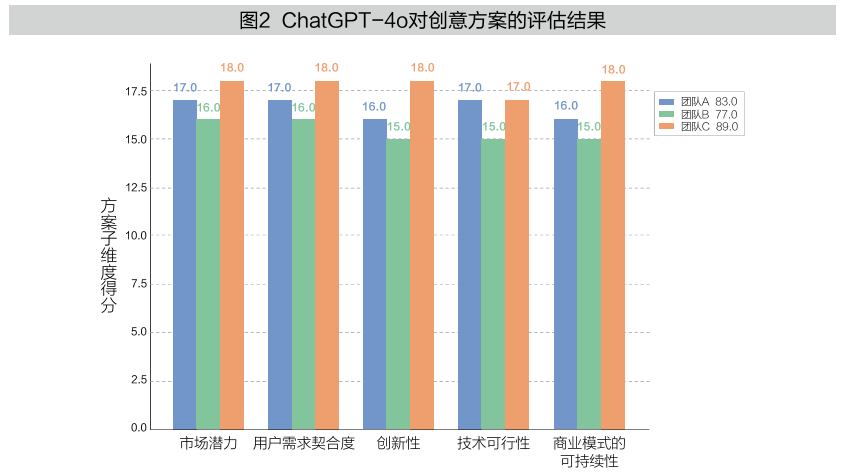 在“新型健康饮食应用”开发的案例中,对于团队提出的多个创意方案,我们利用ChatGPT-4o对其进行评估,并提供反馈。例如,“你将作为资深的市场研究专家,对以下3个‘新型健康饮食应用’开发方案进行评估,并从市场潜力、用户需求契合度、创新性、技术可行性和商业模式的可持续性五个方面给予详细分析,指出每个方案的优缺点,并提出改进建议。”同时,我们还可以借助生成式AI促进评估结果的可视化,提示ChatGPT-4o“通过仔细对比,给出3个方案在这5个维度的评分,每个维度满分20分,并给出综合评分,满分为100分,请将结果输出为3个颜色的柱状图并提供具体的评分依据”(见图2)。进一步地,在对多个方案的优缺点评估的基础上,我们还可以结合一些具体的市场数据,让AI将当前多个方案进行优化与整合。