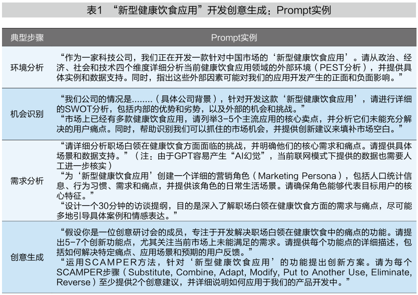 以常见的创意任务为例,如开发一款“新型健康饮食应用”,员工可以直接利用ChatGPT-4生成创意,并通过指定背景、用户群体或用户需求以明确创意的具体要求(见表1)。通过人机持续交互,发散形成多样化的创意点或收敛形成完整的创意方案。此外,根据管理学领域顶级期刊《市场科学》(Marketing Science)的最新研究,大语言模型(Large Language Model,LLM)在市场研究中展现出替代人类参与者的潜力,尤其在品牌感知和产品属性评价方面,LLM的生成结果与人类田野调查的匹配率超过75%,这意味着企业能够利用生成式AI模拟消费者进行访谈和需求分析,从而加深市场洞察并降低市场研究成本。
